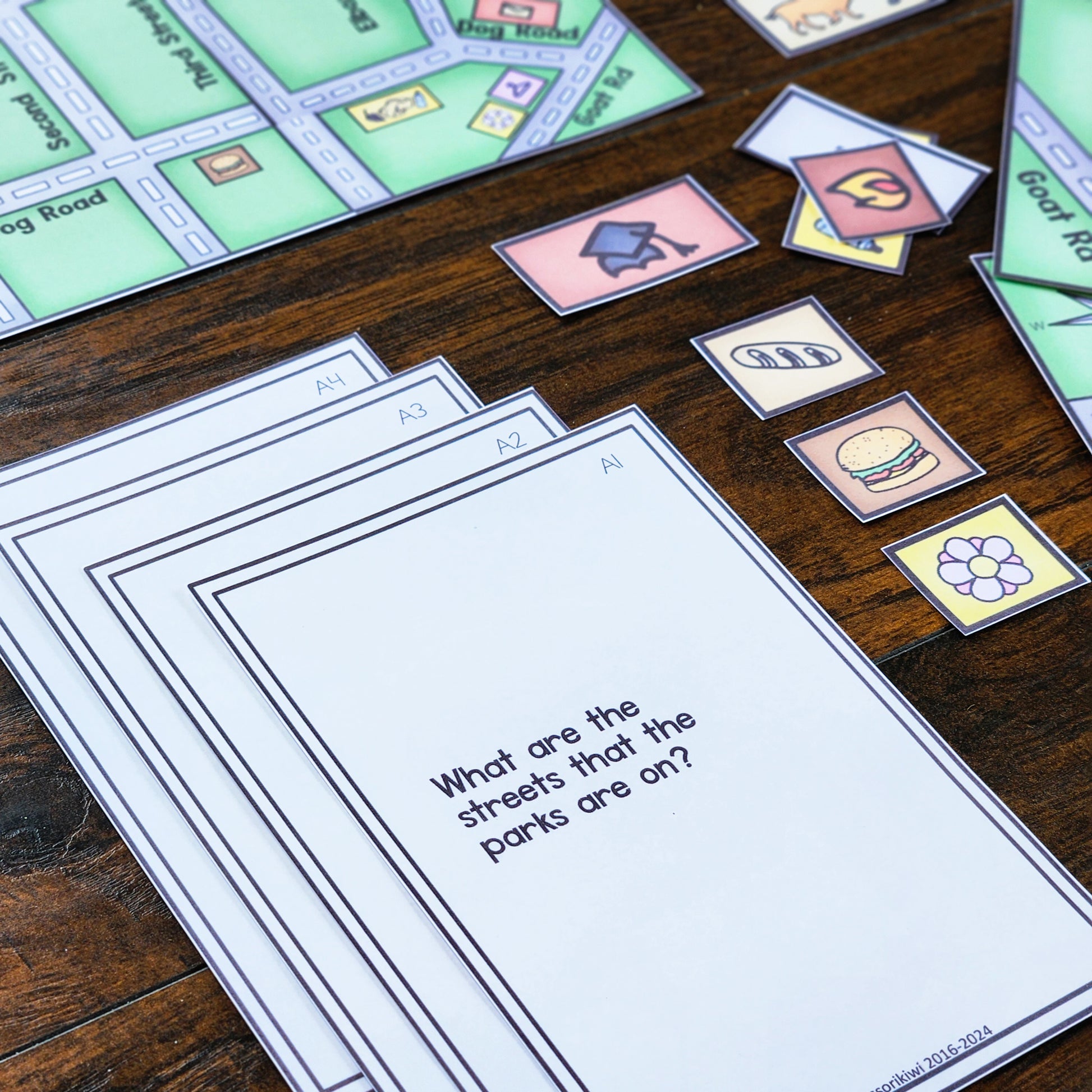 Set A: Map reading - e.g. where is the bakery? Answers included. 12 task cards.