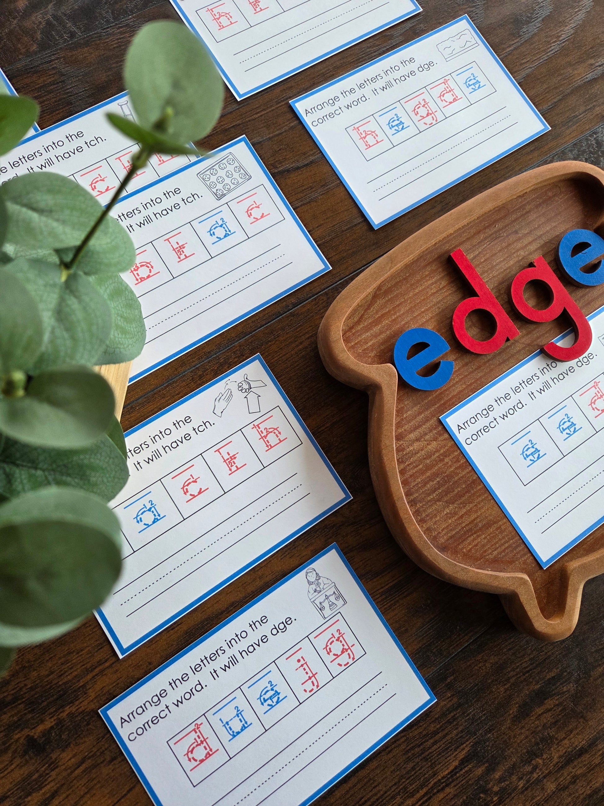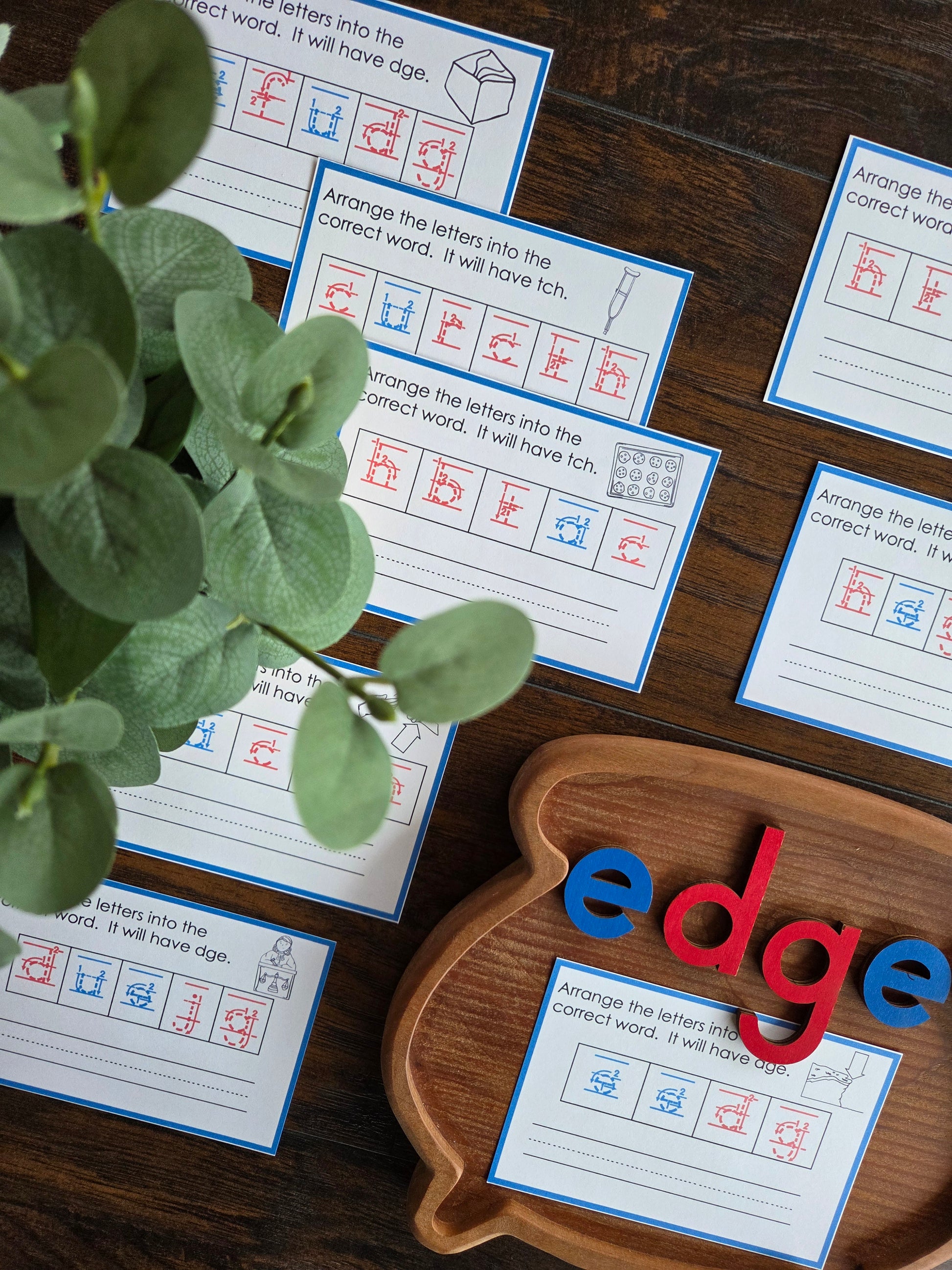 Strengthen your child’s phonics and spelling skills with these Montessori-inspired word reassembly cards. Perfect for 1st and 2nd grade learners in homeschool or classroom settings, this activity helps children practice mapping sounds to letters while mastering the tricky trigraph endings –dge and –tch.